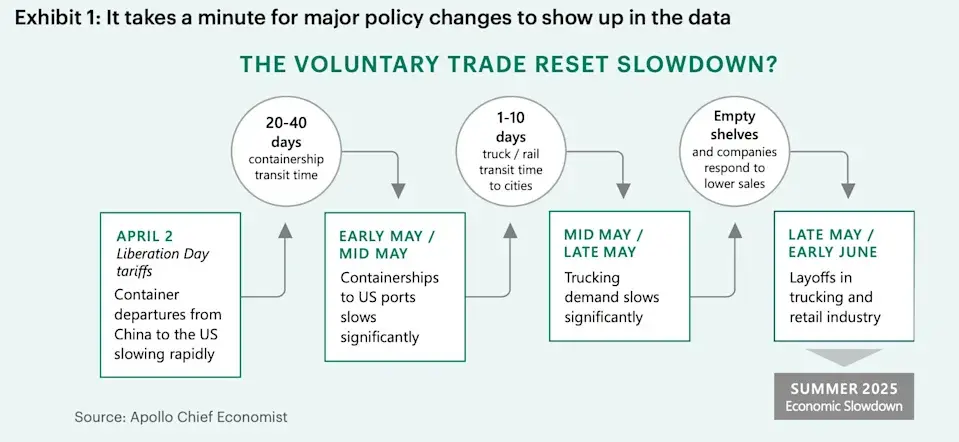這個想法意味著,由於關稅導致美國港口的貨運量和卡車運輸需求放緩,導致貨架空空如也、企業銷售額下降,今年夏天經濟將陷入衰退。