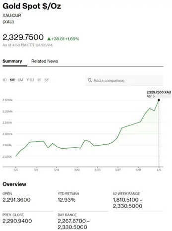 進入4月,金價更是屢刷歷史新高:4月1日,倫敦現貨黃金、COMEX黃金分別站上2260美元、2280美元大關;4月3日,COMEX 6月黃金期價報2315.0美元/盎司,連續第五個交易日創收盤歷史新高;4月4日,現貨黃金也突破2300美元/盎司;4月5日,現貨黃金在短暫下挫後上破2330美元/盎司關口,COMEX黃金期價站上2350美元/盎司。