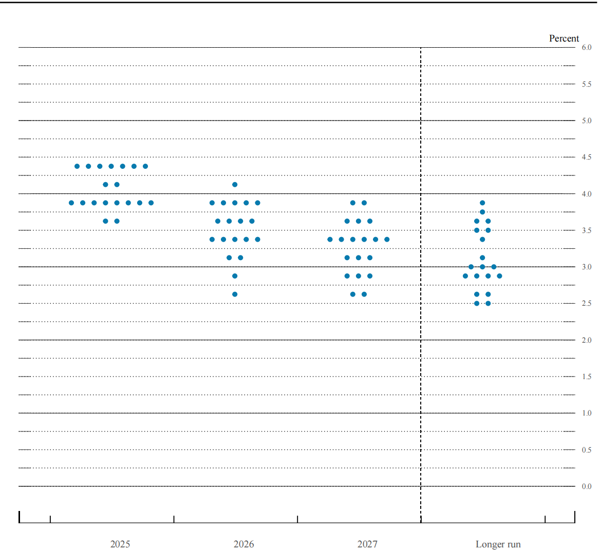 點陣圖顯示,美聯儲維持了3月對今年2次降息的預測,但上調了2026年的利率中值預測。具體來看,美聯儲對2025年聯邦基金利率的中值預測維持在3.9%,對2026年聯邦基金利率的中值預測則由3.4%上調至3.6%。長期中性利率預期值維持在3%。此前的2024年12月,美聯儲在降息的同時同步上調了對2025年、2026年的聯邦基金利率的預期值。