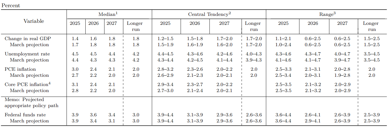 預測今年的失業率為4.5%,較3月的預測上升0.1個百分點;預測今年PCE(個人消費支出)通脹為3%(3月預測值2.7%),2026年將回落至2.4%(3月預測值2.2%);預測今年核心PCE通脹為3.1%(3月預測值2.8%),2026年將回落至2.4%(3月預測值2.2%)。