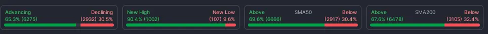 財富管理和研究公司Bespoke報告中稱,自8月5日暴跌至低點以來,市場反彈走高的一個標誌是基礎廣度有多強。“無論你看看創52周新高的股票數量,高於50天移動平均線的股票交易比例,還是上漲股票的淨數量,我們都看到了顯著的改善。”