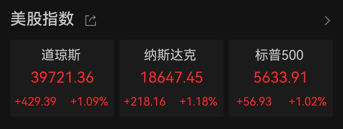 美東時間週三,美股三大指數集體上漲,納指與標普500指數均再創收盤新高。截至收盤,道指漲429.39點,漲幅為1.09%,報39721.36點;納指漲218.16點,漲幅為1.18%,報18647.45點;標普500指數漲56.93點,漲幅為1.02%,報5633.91點。