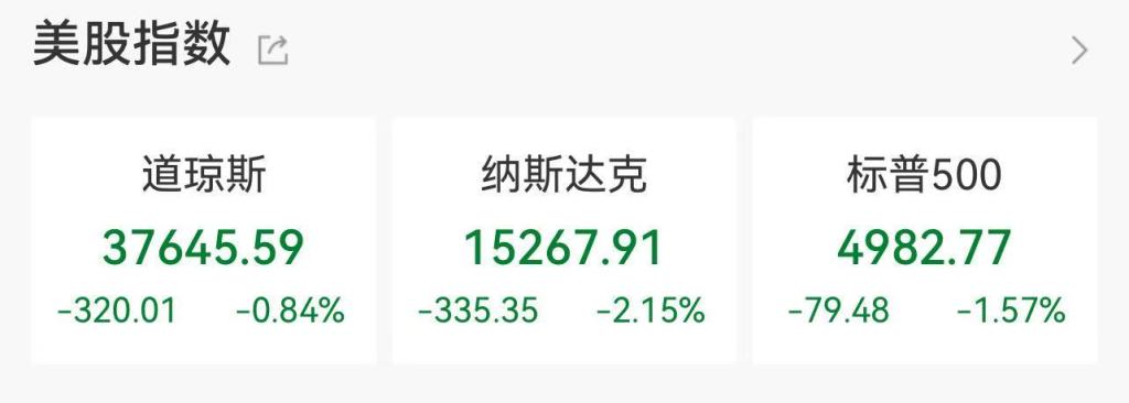 當地時間4月8日,美股三大指數高開漲超3%後悉數震盪跌綠。截至收盤,美股三大指數悉數下跌,道指跌0.84%報37645.59點,標普500指數跌1.57%報4982.77點;納指跌2.15%報15267.91點,年內累計跌幅超過20%。