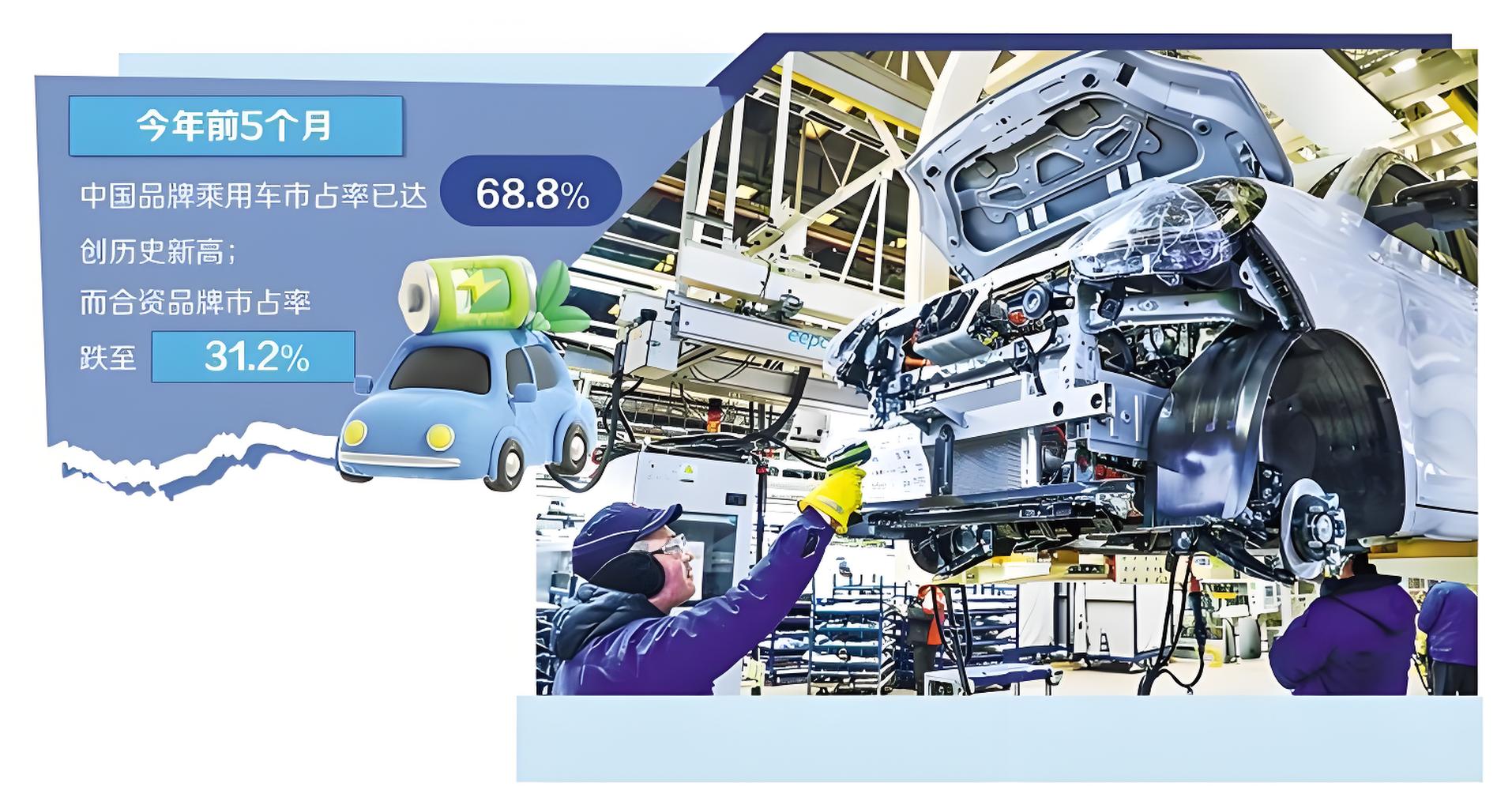 電動化與智能化變革浪潮,不僅在加速汽車產品進化,也在深刻重構市場競爭格局。中汽協數據顯示,今年前5個月,中國品牌乘用車市占率已達68.8%,創歷史新高;而合資品牌市占率跌至31.2%,創出新低。