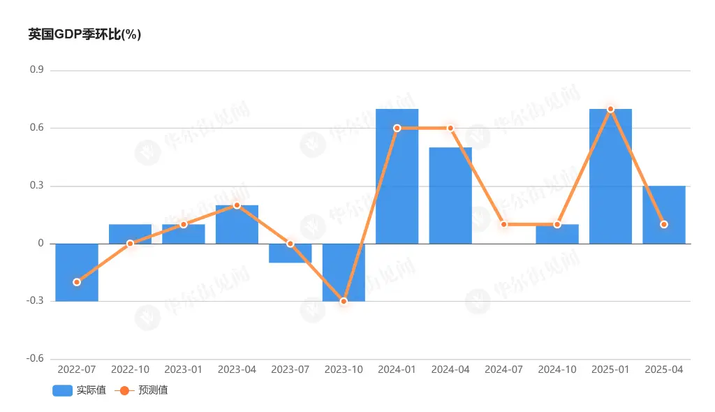 英國國家統計局(ONS)週四公佈的數據顯示,第二季度GDP環比增長0.3%,顯著優於經濟學家和英國央行此前預測的0.1%。更值得注意的是,6月單月產出增長了0.4%,是市場預期的兩倍,扭轉了此前兩個月的溫和下滑態勢。