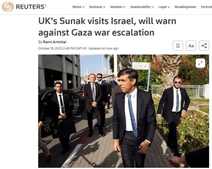 據路透社報導,在落地以色列後,蘇納克告訴記者,“最重要的是,我在這裏表達我對以色列人民的聲援。我希望你們知道,英國和我,與你們站在一起。”