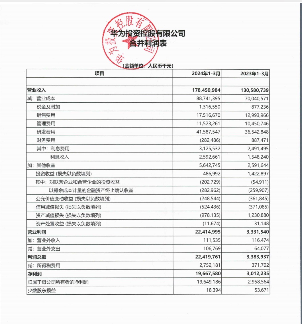 本網綜合報導 4月30日,華為投資控股有限公司披露2024年一季報業績。第一季度營業收入為1784.5億元,去年同期為1305.8億元,同比增長36.66%;營業利潤為224.1億元,去年同期為33.3億元,同比增長573%;歸母淨利潤約196.5億元,去年同期為29.59億元,增長約564%。