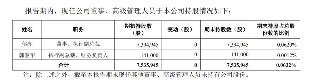 根據萬科2025年半年度報告,現任董事、執行副總裁鬱亮持股7,394,945股,占總股份數比例為0.0620%;執行副總裁、財務負責人韓慧華持股141,000股,占總股份數比例為0.0012%。
