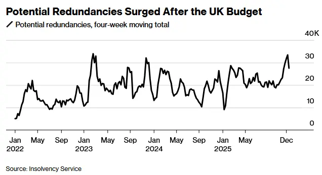 记者獲悉,英國工人正面臨近三年來最嚴峻的失業風險,預算案公佈後勞動力市場的惡化趨勢很可能引起英國央行的警覺,並加劇該央行進一步降息的壓力。據英國破產署的數據,截至去年12月14日的四周內潛在裁員人數(預示未來裁員趨勢的先行指標)飆升至33,392人,創下2023年初以來最高值,也是疫情後的第二高水準。這一數據尤其令人擔憂,因為歷史數據顯示,每年12月裁員數量通常趨於緩和。然而,裁員形勢在英國財政大臣裏夫斯公佈秋季預算案後於上月顯著惡化。