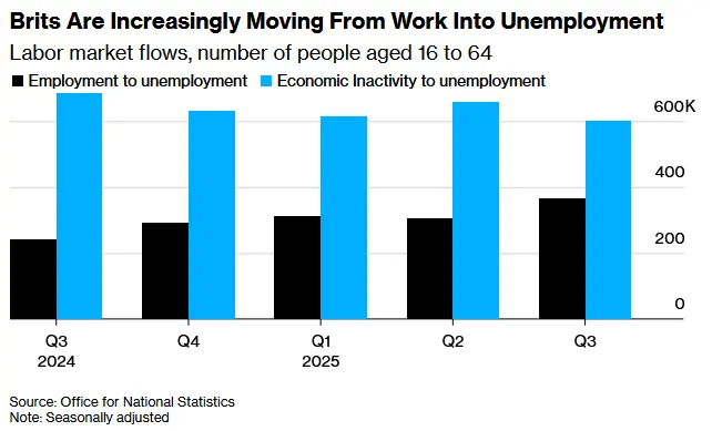 英國官方就業數據同樣顯示裁員壓力上升。在截至去年10月的三個月內,每千名員工裁員率達5.3%,創疫情以來峰值。最新季度數據還表明,失業率攀升主要源於企業主動裁減崗位,而非非經濟活動人口重新求職。