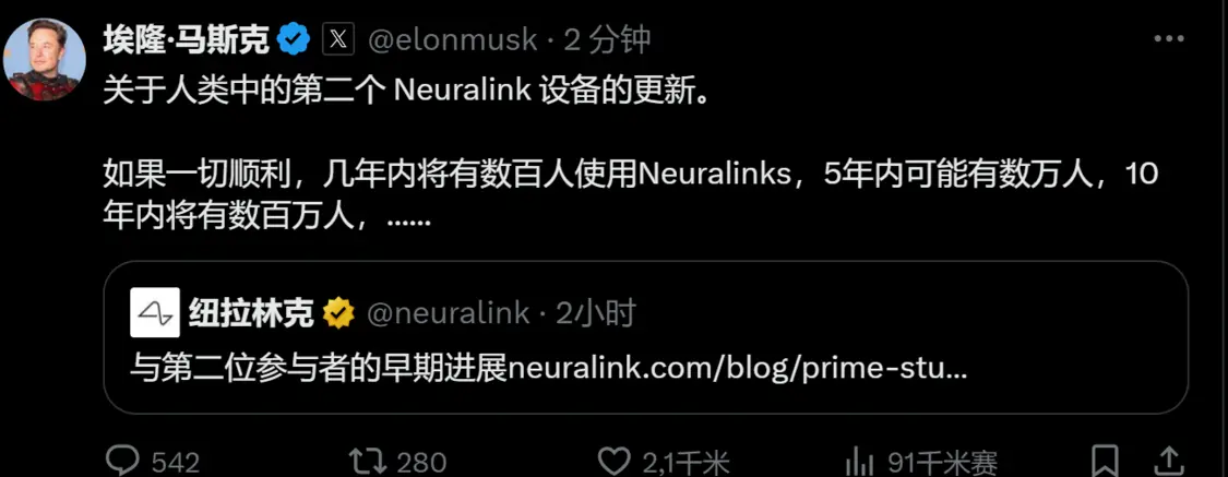 對此,馬斯克在X平臺也對此發佈了最新動態,稱:“如果一切順利,幾年內將有數百人使用Neuralinks,5年內可能有數萬人,10年內將有數百萬人,…”由此可見,馬斯克對於腦機介面未來發展的狀態持以非常樂觀的態度。