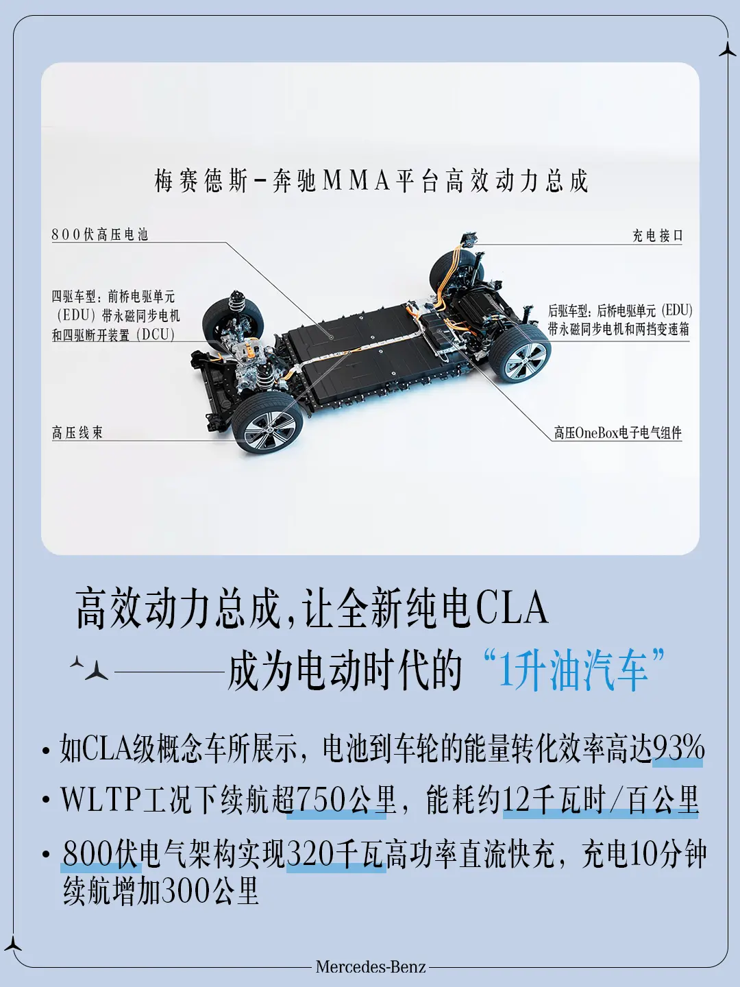 全新純電CLA借助VISION EQXX概念車技術,實現93%能量轉化效率,續航超750公里,百公里能耗約12千瓦時。800伏電池架構、碳化矽逆變器及兩擋變速箱,提升能效並降低能耗,電池設計兼顧高密度與輕量化。