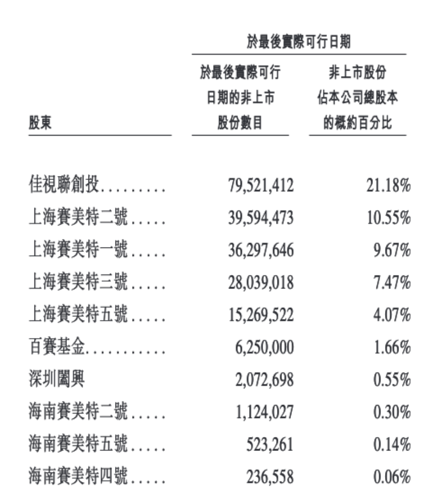李鋼江及倪瓊,連同管理層股東(即佳視聯創投、百賽基金、上海賽美特一號、上海賽美特二號、上海賽美特三號、上海賽美特五號、海南賽美特二號、海南賽美特四號及海南賽美特五號)、上海佳瑞佳妮、佳佳控股、佳視聯私募及深圳闔興為本公司控股股東集團。此外,賽美特股東還包括華為旗下哈勃投資、紅土善利、中網投、比亞迪、創啟開盈、韋豪鋆軒、上海科創基金、天善知行、長三角基金、上海辰鈞、北京裕潤、無錫崇緯、立昂微及G60科創基金等。