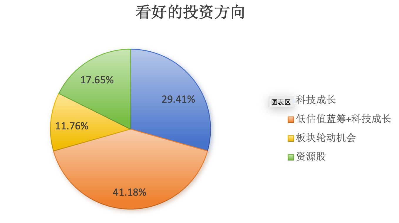 關於看好的投資機會,私募排排網調查問卷結果顯示,41.18%的私募看好低估值藍籌+科技成長方向,考慮到攻守平衡,將傾向於啞鈴型組合結構;29.41%的私募看好科技成長方向,認為科技成長依然是市場核心主線;17.65%的私募看好資源股,認為有色等資源品價格牛市未完;11.76%的私募看好板塊輪動機會,認為市場輪動和高低切特徵會更加明顯,看好傳統消費、傳統製造業、高股息等方向的輪動機會。