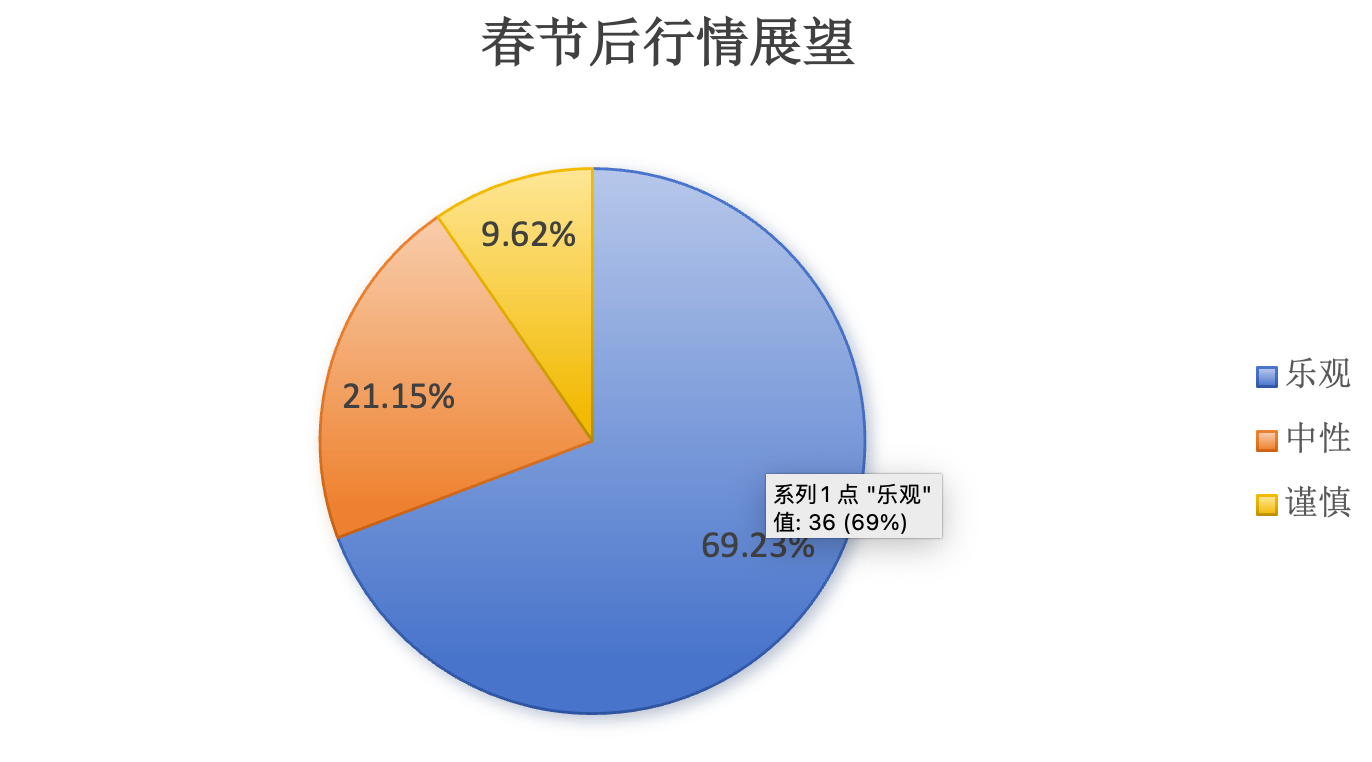 關於節後A股行情展望,私募排排網調查問卷結果顯示,69.23%的私募對節後行情持樂觀態度,認為春節前市場整固較為充分,節後A股有望企穩向上,重啟升勢;21.15%的私募對節後行情持中性態度,認為市場多空因素交織,節後指數仍有整固需求,重點關注結構性機會;9.62%的私募對節後行情持謹慎態度,認為市場結構性估值泡沫仍偏多,節後市場主要股指和個股賺錢效應可能回落。