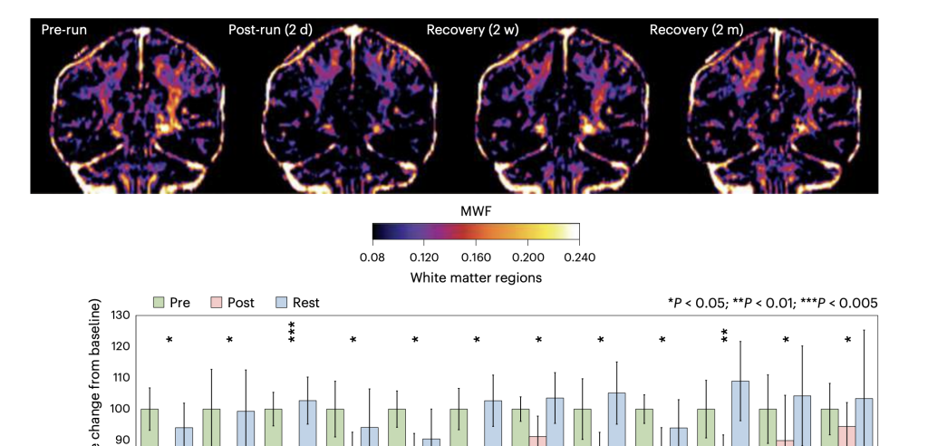 通過測量髓鞘水分數(MWF)——髓鞘含量的一個替代指標,研究人員發現,馬拉松比賽後,跑者大腦50個白質區域中,12個白質區域的髓鞘含量發生一致性且顯著的區域性降低。兩周後,相關腦區髓鞘含量顯著上升,但仍未回到賽前水準;兩個月後則完全恢復至賽前狀態。