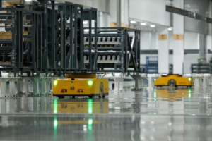 大眾安徽MEB工廠中,AGV小車(自動導向搬運車)自由穿梭。