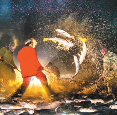 馬頭琴悠揚,漁工號子響。踏上冰封雪覆的湖面,在查幹湖第二十二屆冰雪漁獵文化旅遊節現場,鼎沸的人聲仿佛驅散了寒意。遊客興致勃勃地趕往出魚口,觀冬捕、嘗鮮魚、購大魚,感受無比震撼的“冰湖騰魚”盛景。