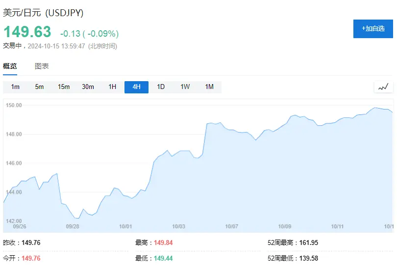 行情顯示,日元已經連續第二周下跌,週一時一度逼近150關口。截至發稿,美元/日元報149.63。