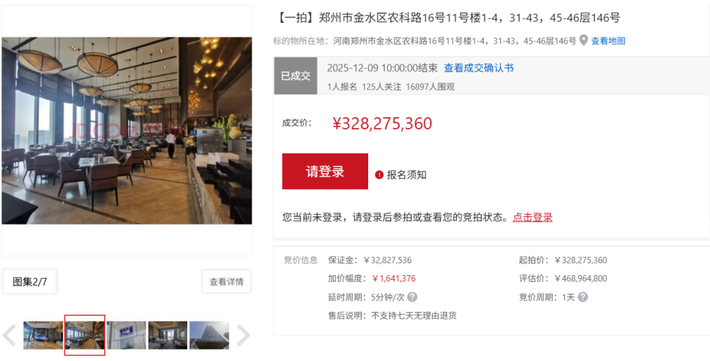 12月9日,據京東資產拍賣平臺資訊,位於鄭州市金水區農科路16號11號樓1-4,31-43,45-46層146號的不動產以3.28億元的底價拍出。