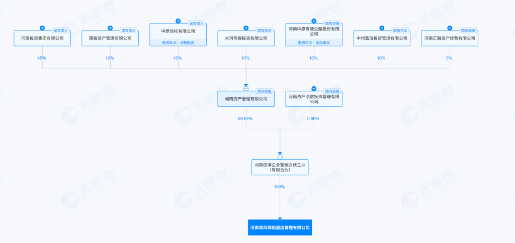 天眼查披露的資訊顯示,河南鄭風鄭韻酒店管理公司為河南信淳企業管理合夥企業(有限合夥)全資子公司,國有控股企業河南資產管理有限公司持有後者99.94%股權。