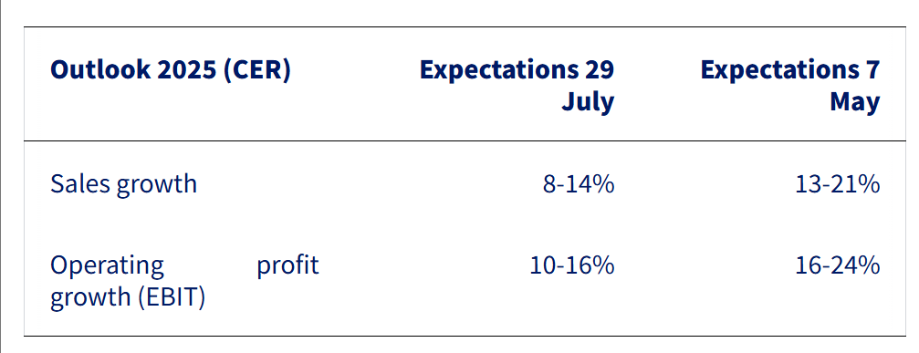 GLP-1藥物司美格魯肽是諾和諾德的明星產品,2024年全球收入超292億美元,與全球醫藥行業“銷冠”僅一步之遙。由於減肥藥市場的火熱,諾和諾德以及行業最初對業績都給予很高期待,但今年以來的市場表現之下,這種期待在不斷下降。此次,諾和諾德再次下調了2025年全年的業績預期,預計銷售增長為8%至14%,營業利潤增長為10%至16%。
