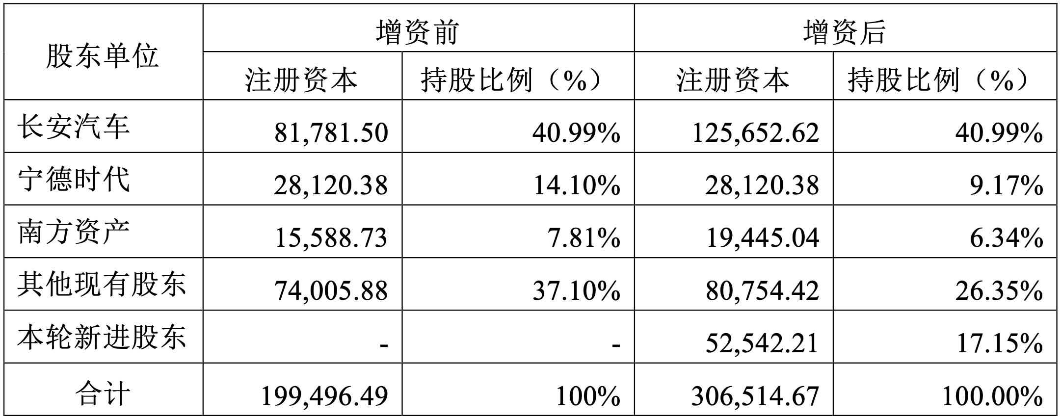本次增資完成後,長安汽車持股比例保持40.99%不變,南方資產持股比例由7.81%稀釋到6.34%,安渝基金持股比例為8.81%,交銀投資持股比例由1.76%上升至3.34%。