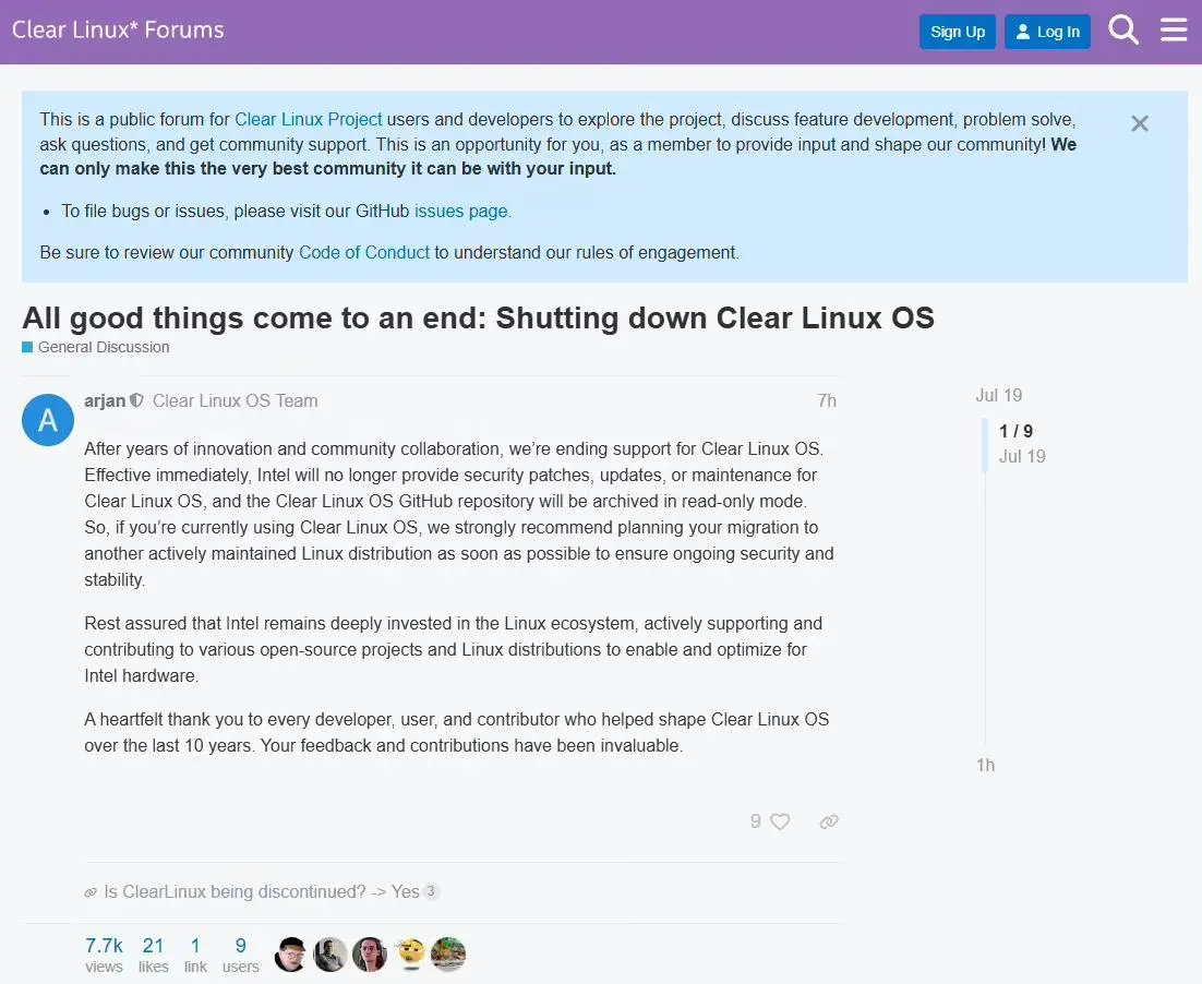 7 月 19 日消息,今日一早,英特爾在社區發佈公告,宣佈終止其性能優化的 Clear Linux OS 發行版。