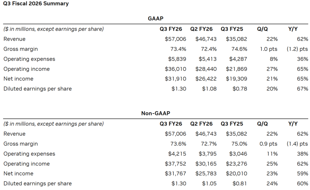 當地時間11月19日美股盤後,英偉達(Nasdaq:NVDA)發佈了截至10月26日的2026財年第三財季財報,期內實現營收570.06億美元,同比上漲62%,高於市場預期的542億美元;美國通用會計準則(GAAP)下淨利潤319.10億美元,同比上漲65%;Non-GAAP下每股攤薄收益為1.30美元,同比上漲60%,超出市場預期的1.25美元。