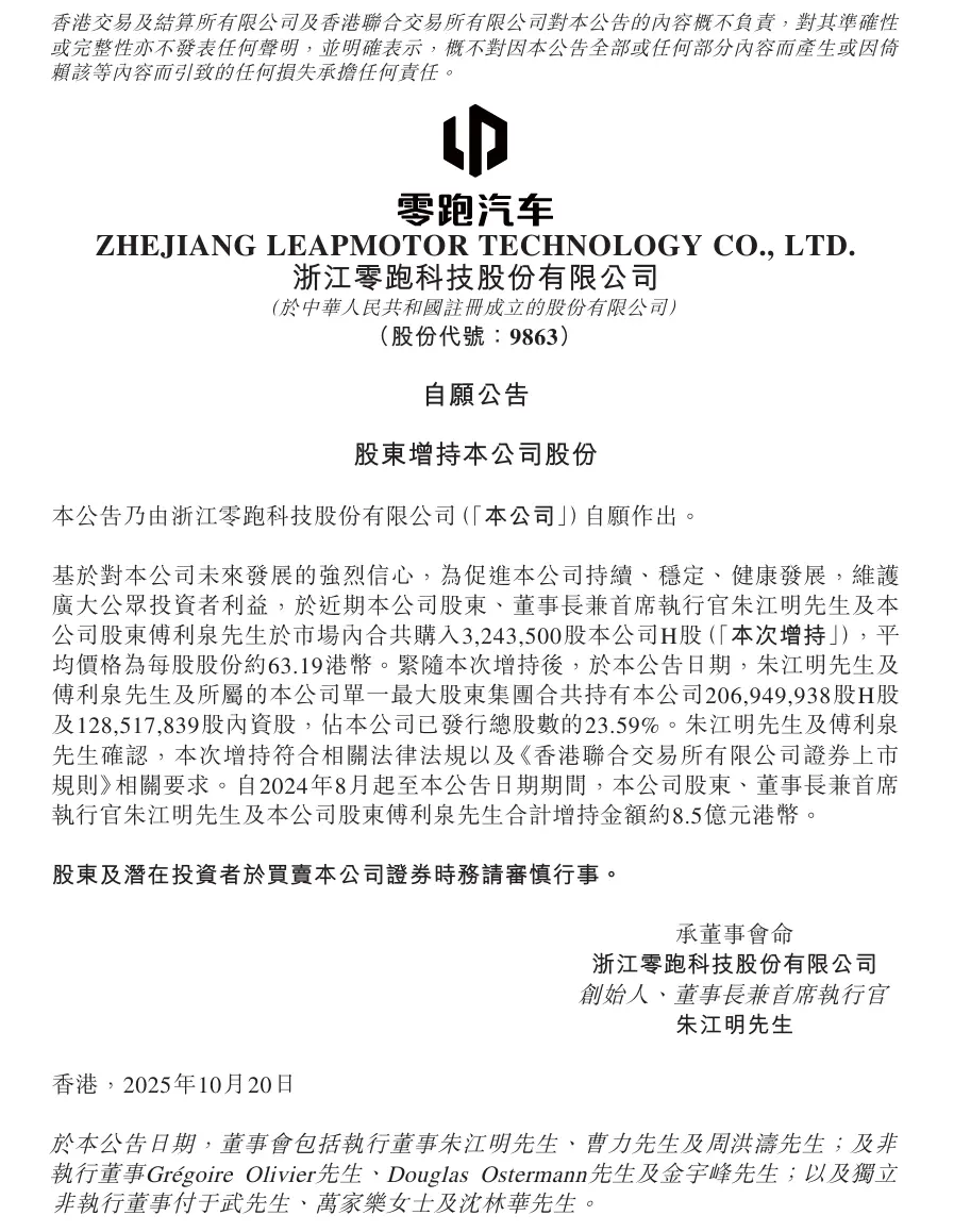 10 月 20 日消息,零跑汽車今日公告,基於對本公司未來發展的強烈信心,為促進本公司持續、穩定、健康發展,維護廣大公眾投資者利益,於近期本公司股東、董事長兼首席執行官朱江明先生及本公司股東傅利泉先生在市場內共計購買 3,243,500 股本公司 H 股(“本次增持”),平均價格為每股約 63.19 港幣(注:本次增持計算金額約 2 億港幣)。