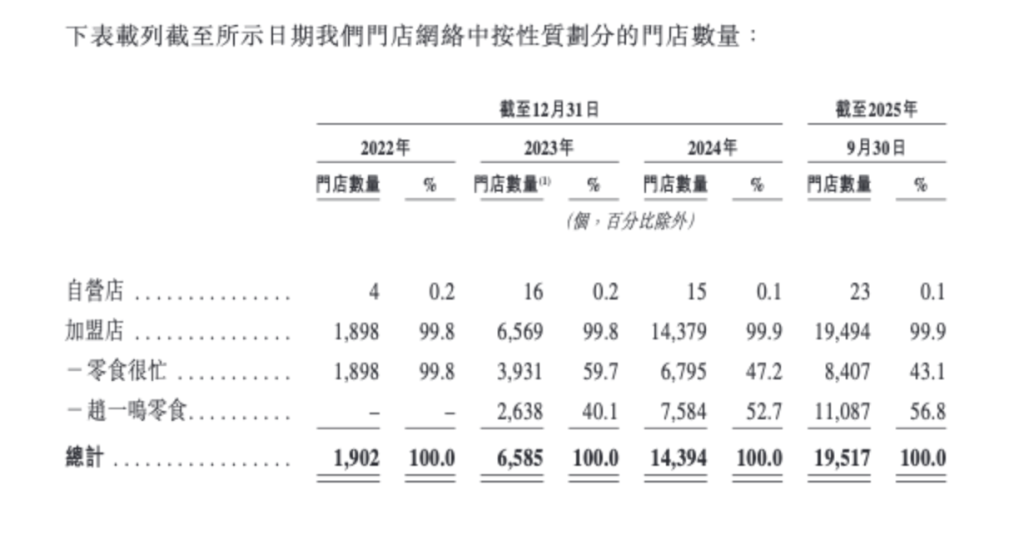 在中國零售行業,加盟模式是常見市場慣例。鳴鳴很忙的業務發展也依賴於加盟商。招股書顯示,截至2025年11月30日,鳴鳴很忙的門店數量達到21041家,其中包含中國23家自營店及21018家加盟店。