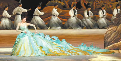 近年來,國風雅韻成為審美新風尚。以《千裏江山圖》為代表的青綠山水,啟示美術工作者在服裝設計、工藝美術、舞臺藝術等領域開拓創新。在2022年北京冬奧會花樣滑冰團體賽冰舞自由舞比賽中,一對中國選手演繹了花滑版《只此青綠》,男選手的服裝上繪有“青峰疊嶂”,女選手的衣裙則如“綠水浮雲”,隨著冰鞋滑動,青綠相映,剛柔兼濟,藝術之美與競技之美相交融。2023年杭州亞運會開幕式上,北京服裝學院教授楚豔領銜設計的“水天碧”長裙,以漸變的青綠色彩、3D複合工藝製作的亭臺樓閣和樹木紋樣,讓“千裏江山圖”的意境隨著舞步緩緩生髮。這些實踐表明,越來越多的美術工作者創新思維、拓展視野,用當代審美啟動傳統文化基因。