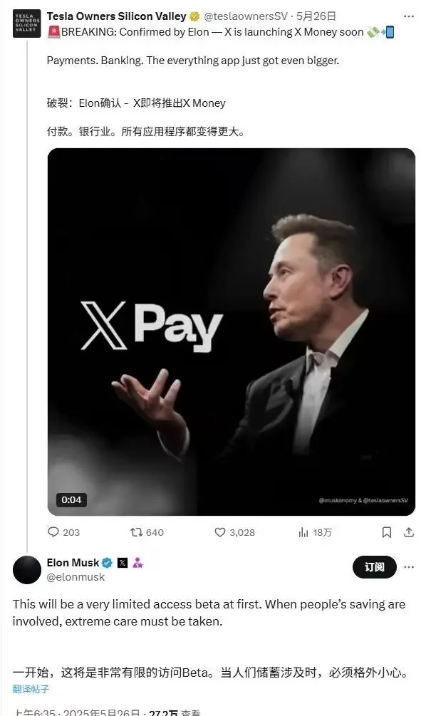 5 月 27 日消息,馬斯克昨日在回應有關「埃隆確認 X 即將推出 X Money」的新聞時表示:初期僅限於非常小規模的 Beta 測試。當涉及到用戶儲蓄時,必須格外謹慎。