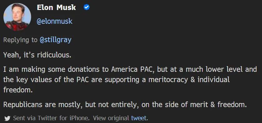 馬斯克週二在X的貼文中承認,自己曾向支持特朗普參選總統的美國政治行動委員會(America PAC)捐款,但比報導的金額低得多。