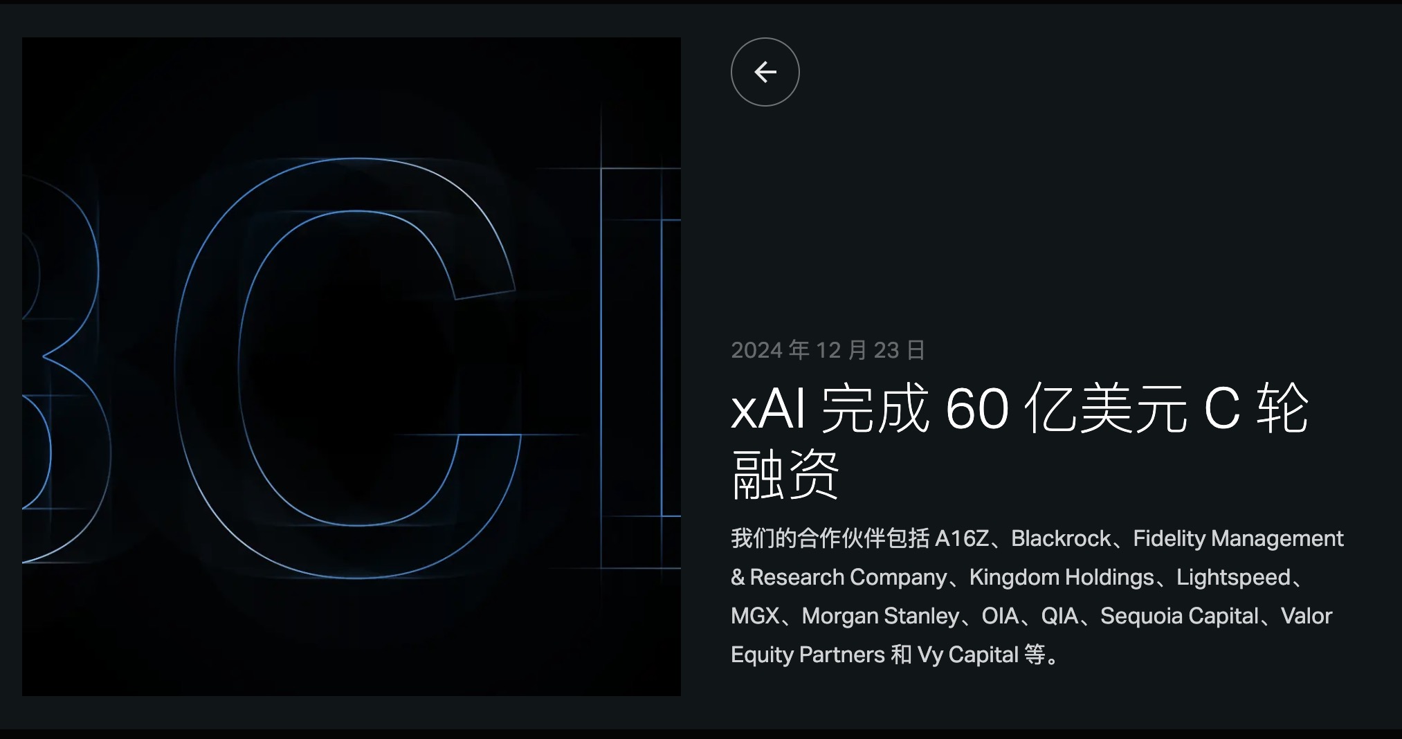 12月24日,埃隆·馬斯克的人工智慧公司xAI在其官網宣佈已完成60億美元(約合人民幣438億元)C輪融資,此次融資將用於進一步加速他們的基礎設施,加速未來技術的研發,以實現瞭解宇宙真實本質的使命。目前xAI公司的市值已超過400億美元。