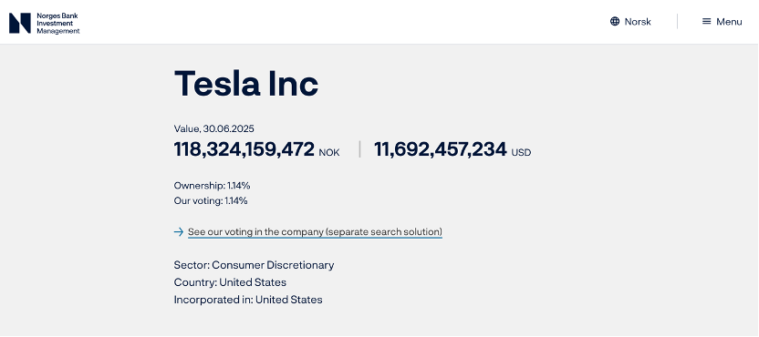該基金是全球同類基金中規模最大的一家,同時也是特斯拉的第七大單一股東。官網顯示,該基金持有特斯拉1.14%的股份。該項投資的價值約為1183億挪威克朗(約合117億美元)。