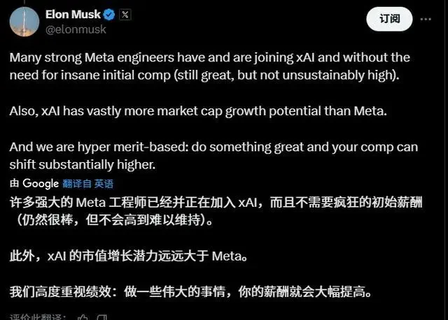 8 月 4 日消息,埃隆・馬斯克透露,儘管 xAI 初始薪酬待遇沒有高得“離譜”,但 Meta 旗下多名高級工程師正轉投其人工智慧公司 xAI。馬斯克表示,從長遠來看,xAI 的估值有望超越 Meta。他還強調,xAI 有為頂尖人才提供大幅加薪的傳統。