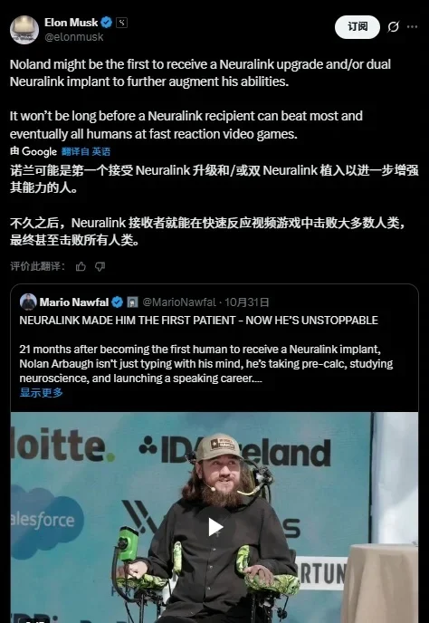 馬斯克的這一言論源於他對一條 X 平臺帖子的回復。該帖子詳細介紹了全球首位 Neuralink 植入者諾蘭德・阿博(Noland Arbaugh)目前的生活狀況。自接受植入手術以來,阿博已逐步重拾正常生活,如今他可以玩遊戲、參加課程,並受聘擔任有償演講嘉賓。