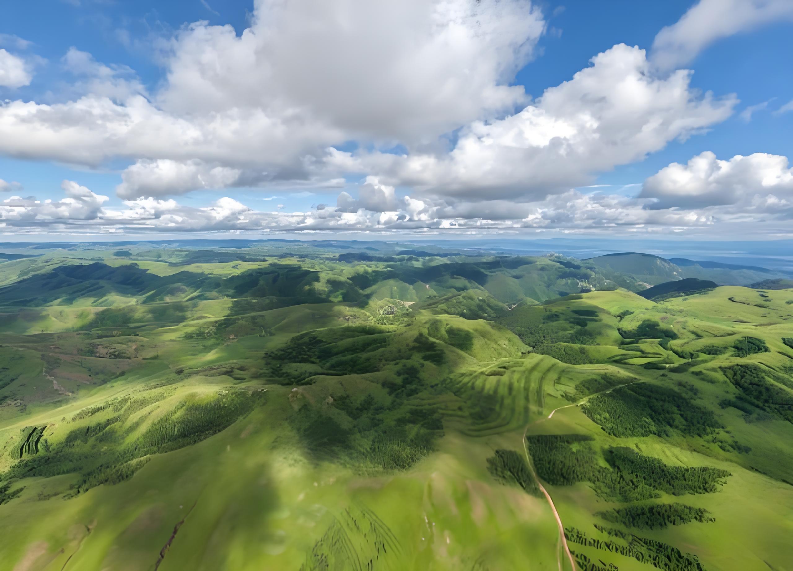 盛夏時節,位於內蒙古呼和浩特市新城區黃花窩鋪村的敕勒川高山草原綠意盎然,風景如畫。