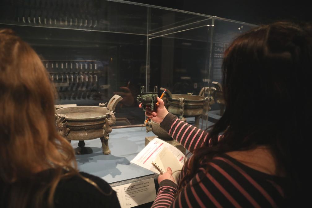 涅槃的鳳凰、纏繞的螭蟒與長角的神獸……一件件散發東方神秘與古樸氣息的青銅器深深吸引了前來參觀的美國學生們的目光。