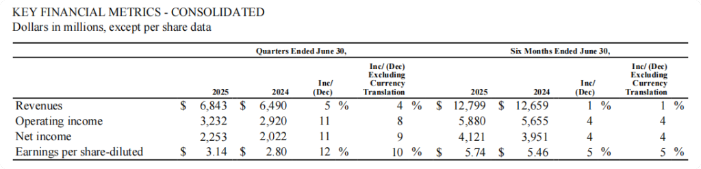 美東時間8月6日美股盤前,麥當勞(MCD:US)公佈了截至2025年6月30日的第二季度業績,二季度營收、淨利和每股收益均超出市場預期。財報顯示,麥當勞第二季度實現營業收入68.43億美元,不考慮匯率影響同比增長4%;實現淨利潤22.53億美元,不考慮匯率影響同比增長9%。調整後每股收益為3.19美元,不考慮匯率影響同比增長5%。上半年,麥當勞實現營業收入127.99億美元,不考慮匯率影響同比增長1%;實現淨利潤41.21億美元,不考慮匯率影響同比增長4%。