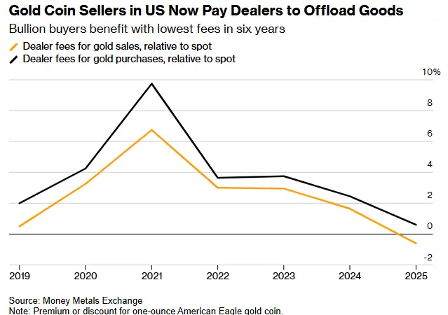 數據顯示,美國市場上的金條和金幣目前正出現供過於求的狀況,部分貴金屬經銷商已將溢價降至六年來的最低水準以刺激銷售。當散戶投資者試圖出售黃金時,現在需要支付給經銷商額外費用才能成功脫手。