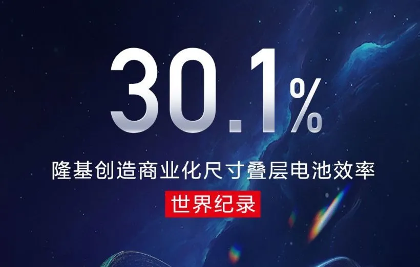 經德國弗勞恩霍夫太陽電池研究所 (Fraunhofer ISE) 第三方獨立認證,隆基疊層團隊研製的商業化 M6 尺寸晶矽-鈣鈦礦疊層電池實現 30.1% 的光電轉換效率,較此前 28.6% 的世界紀錄提升 1.5 個百分點。