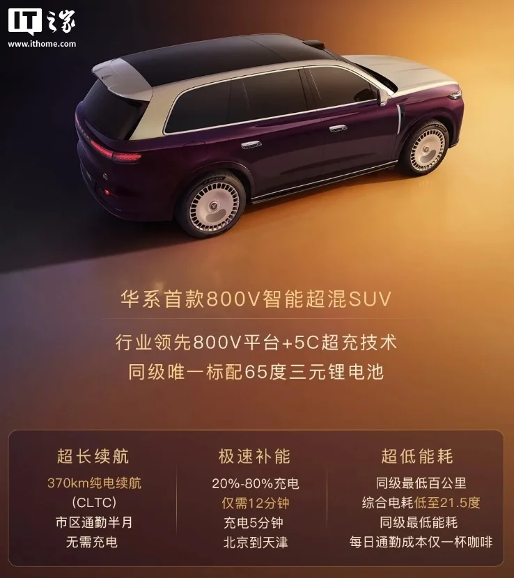動力方面,該車是“華系首款 800V 智能超混 SUV”,搭載 800V 平臺 + 5C 超充,標配 65 度三元鋰電池,CLTC 純電續航 370km。