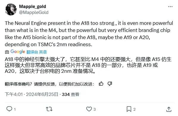 本網綜合報導  @MappleGold 昨日(6 月 25 日)發佈推文,表示蘋果 A18 晶片中的神經引擎算力要優於 M4 晶片,意味著可以在本地運行 AI 模型,更好地駕馭各種 AI 任務。