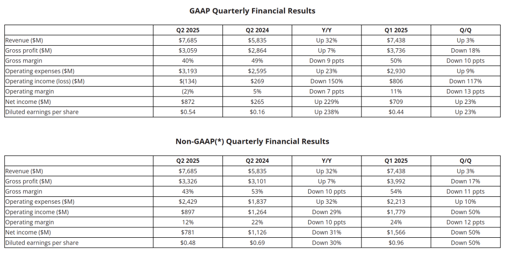 當地時間8月5日美股盤後,AMD公佈了截至2025年6月30日的第二季度業績,報告期間公司營收達到76.85億美元,同比增長32%,高於市場預期的74億美元;美國通用會計準則下(GAAP)淨利潤為8.72億美元,上年同期為2.65億美元,同比大幅增長229%。