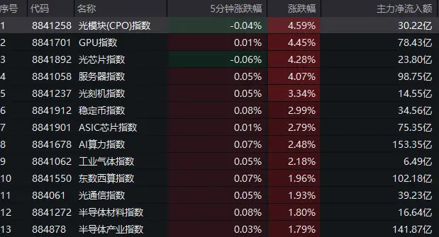 ASIC晶片指數現價2148.29,漲2.79%,主力淨流入額75.35億;AI算力指數漲2.48%,主力淨流入153.35億元,資金湧入明顯;工業氣體、東數西算、光通信、半導體材料指數也均獲不同程度上漲,東數西算主力淨流入也達到102.18億元。