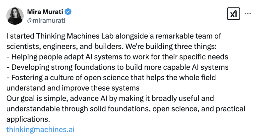 對於成立願景,該公司稱:“雖然人工智慧能力已經取得了巨大進步,但關鍵差距依然存在。科學界對前沿人工智慧系統的理解落後於快速發展的能力。關於如何訓練這些系統的知識主要集中在頂級研究實驗室,這既限制了關於人工智慧的公開討論,也限制了人們有效使用人工智慧的能力。而且,儘管這些系統潛力巨大,但人們仍然很難根據自己的具體需求和價值觀對其進行定制。為了彌合這些差距,我們正在建立Thinking Machines Lab,以使人工智慧系統被更廣泛地理解、可定制並具有普遍能力。”