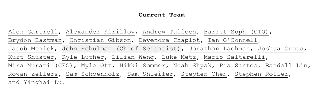 根據名單,穆拉蒂任公司CEO,約翰·舒爾曼(John Schulman,OpenAI聯合創始人)任首席科學家、巴雷特·佐夫(Barret Zoph,OpenAI前研究副總裁)擔任CTO,北大校友翁荔(Lilian Weng,OpenAI前研究副總裁)、喬納森·拉赫曼(Jonathan Lachman,OpenAI 前特別專案負責人)以及亞曆山大·基裏洛夫(Alexander Kirillov,ChatGPT語音模式共同創建者、多模態後培訓負責人)也現身其中,29人的初始團隊中半數都有OpenAI的工作背景,還有的來自穀歌、Meta和X等。