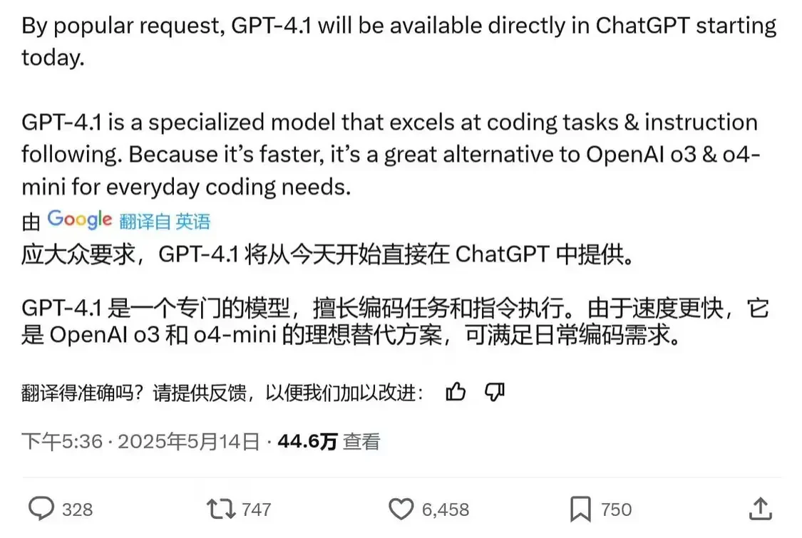 5 月 15 日消息,OpenAI 官方帳號在 X 平臺發佈推文,宣佈將於昨日(5 月 14 日)開始,在 ChatGPT AI 聊天機器人中,引入 GPT-4.1 模型。